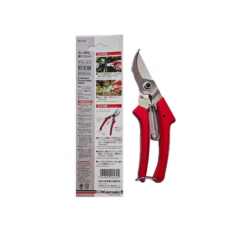 قیچی هرس کاماکی مدل 60 محصول کشور ژاپن است و در دستهی ابزارهای باغبانی حرفهای قرار میگیرد. سازندهی آن، برند معتبر Kamaki با بیش از 50 سال تجربه در طراحی ابزارهای باغبانی، این مدل را برای دوام بالا و دقت ویژه در برشهای تمیز تولید کرده است. تیغهها از فولاد ضدزنگ ژاپنی ساخته شدهاند و نسبت به رطوبت و زنگزدگی مقاومت بسیار بالایی دارند. دستهی ارگونومیک قیچی کاماکی 60، از جنس پلاستیک فشرده با طراحی ضدلغزش ساخته شده که باعث میشود هنگام کار طولانی، دست خسته نشود.